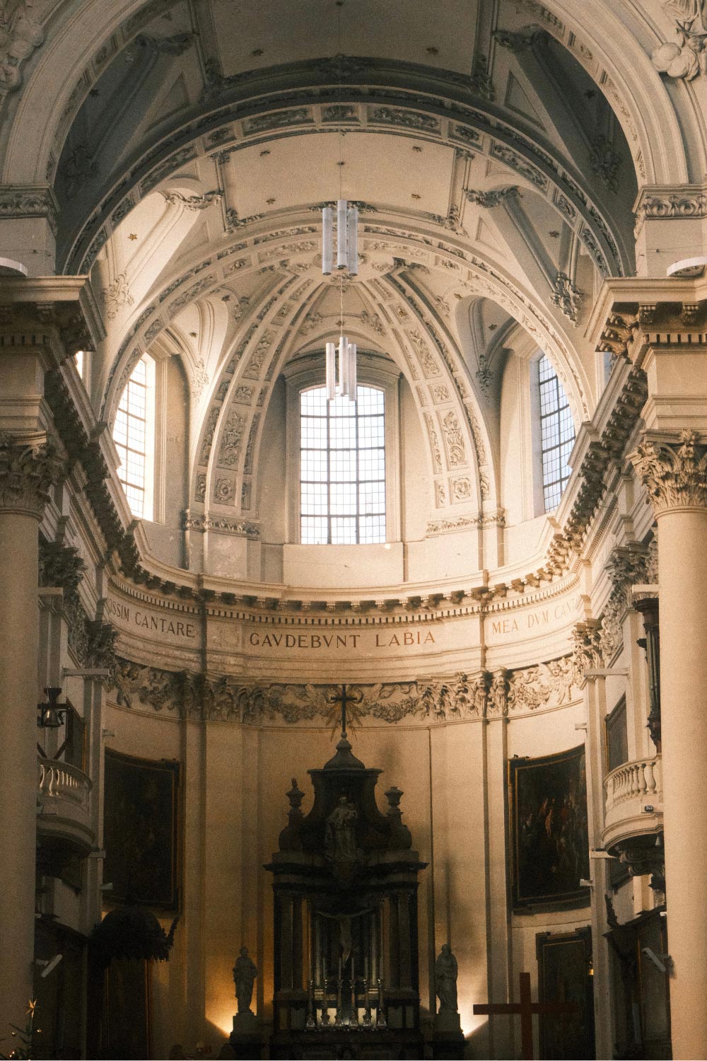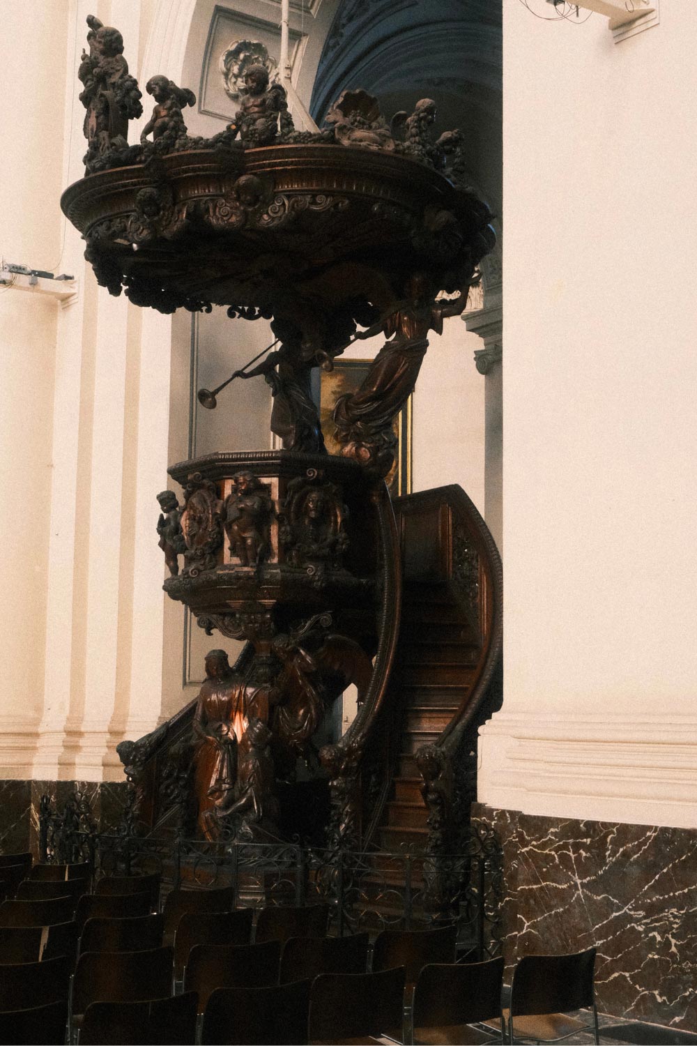 The Saint-Loup Church is located in the historic centre of Namur and is listed as an exceptional heritage site of Wallonia. Built in the 17th century, it is a remarkable example of Baroque architecture and easily one of the most impressive churches we have seen. Compared to St. Aubin’s Cathedral, the interior here feels much darker and far more detailed. The marble elements, elaborate ceiling, beautifully carved wooden confessionals, and impressive organs create a very distinctive interior.